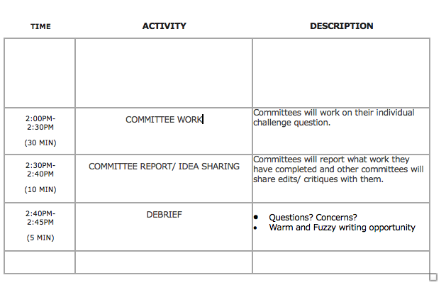 I developed six lesson plans (that are currently under evaluation and an example has been attached below) for each roundtable at National 4-H Conference. I have broken the time given to the delegates and I down to the minute with tasks and goals. Unfortunately, I am unable to be more specific with my plans due to this roundtable being delegate driven. I will most likely have to adjust my plans throughout the conference, to best fit their needs.